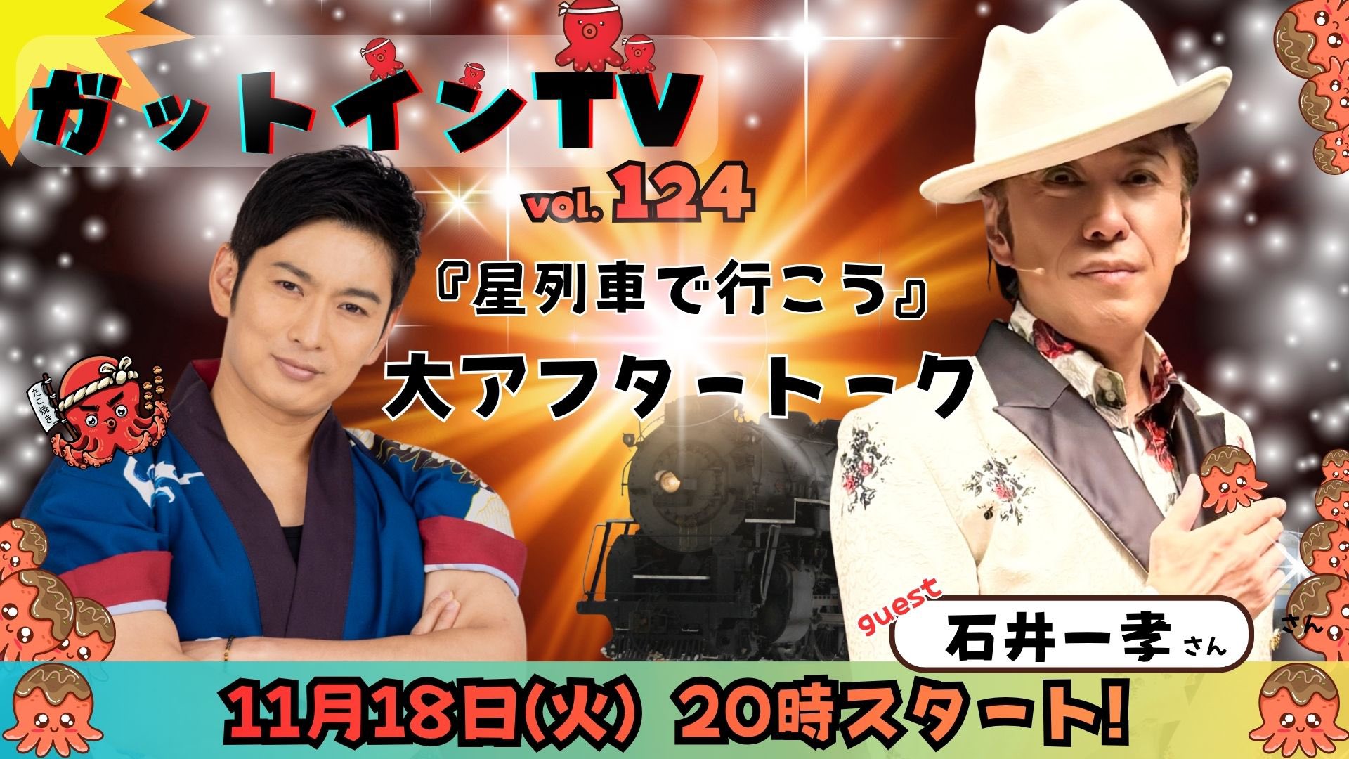 11/18(火) ニコニコチャンネル「松田悟志のガットインTV vol.124」に、石井一孝がゲスト出演いたします。舞台『星列車で行こう』再演ver.も無事大千穐楽の幕が降り、満を持しての「大アフタートーク祭り」!公演の裏側のオモシロ話はもちろん、公演期間中のあれこれ、皆様からのご質問へのアンサー祭りなど様々なお話でワイワイいたします!松田悟志さんと石井の仲良しトークをどうぞお楽しみに♪
