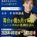 2026年4月1日 / 最終更新日 : 2026年4月1日 kazutaka CULTURE NHK文化センター青山教室 特別講義「舞台が動き出す瞬間」再配信のお知らせ 人生最高のGWを過ごすオンデマンドで、“今の私”をひらく特別な時間 2026年1月18日にNHK文化センター 青山教室で開催され、好評を博した石井一孝 特別講義「舞台が動き出す瞬間 ミュージカルの裏側を語る」がオンデマン […]